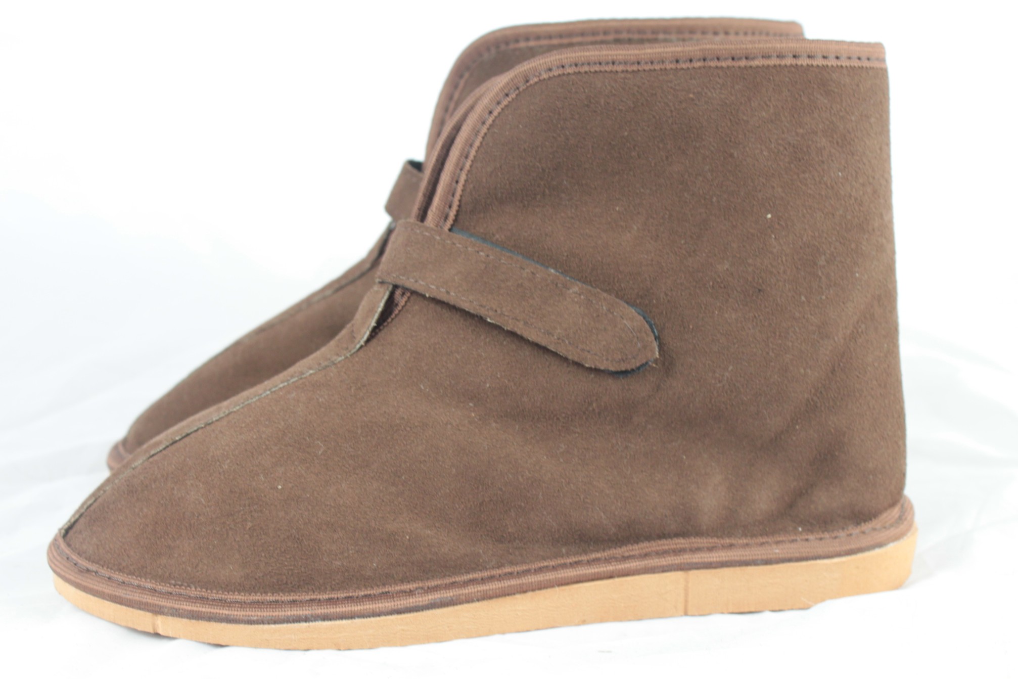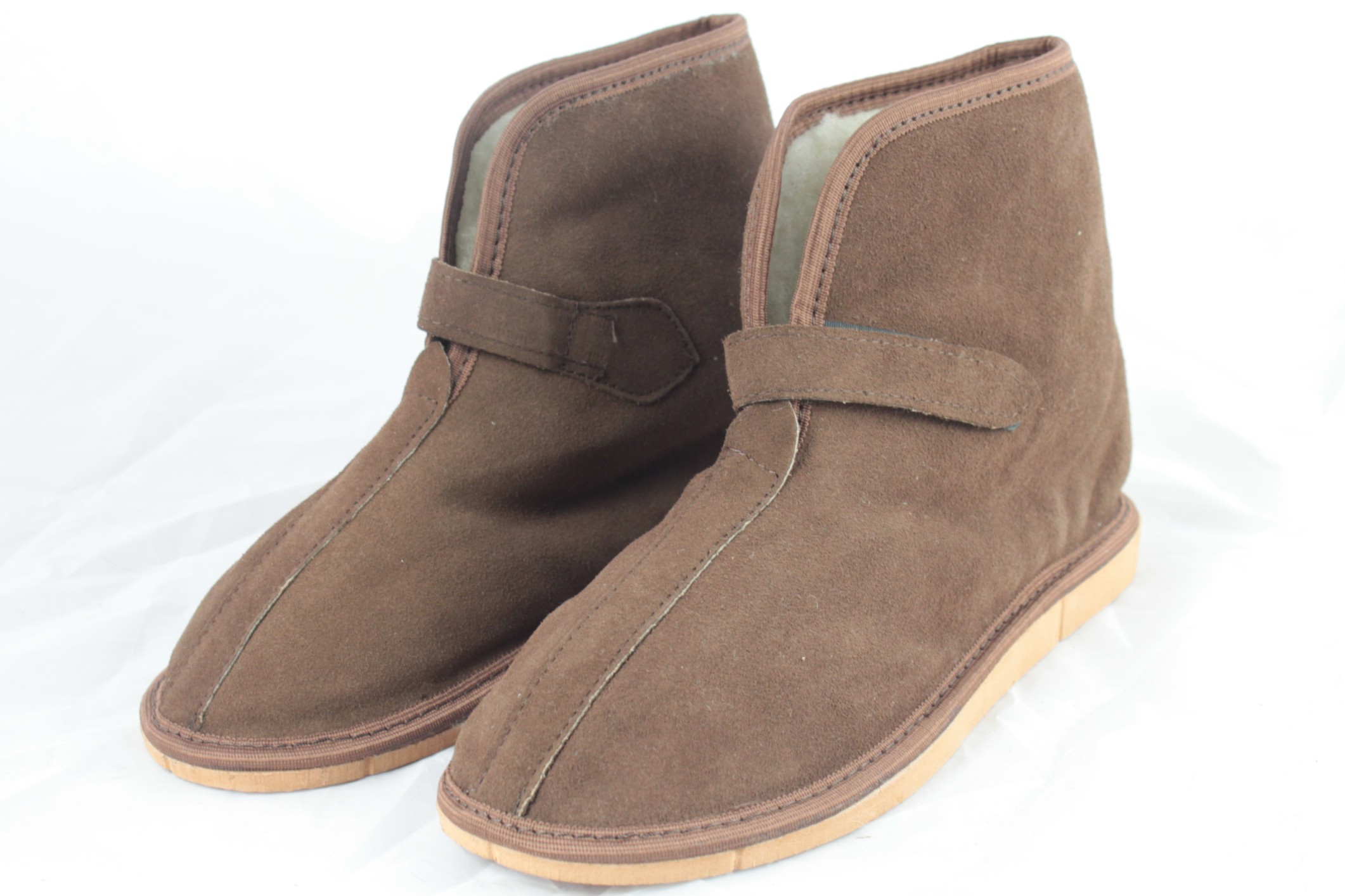 Bambosze zapinane na rzep, model unisex. Produkt wykonany z wysokiej jakości skóry welurowej. Środek wykonany z naturalnej wełny, podeszwa wykonana z gumy antypoślizgowej.