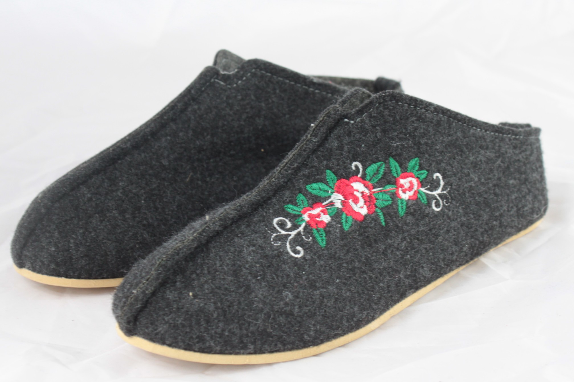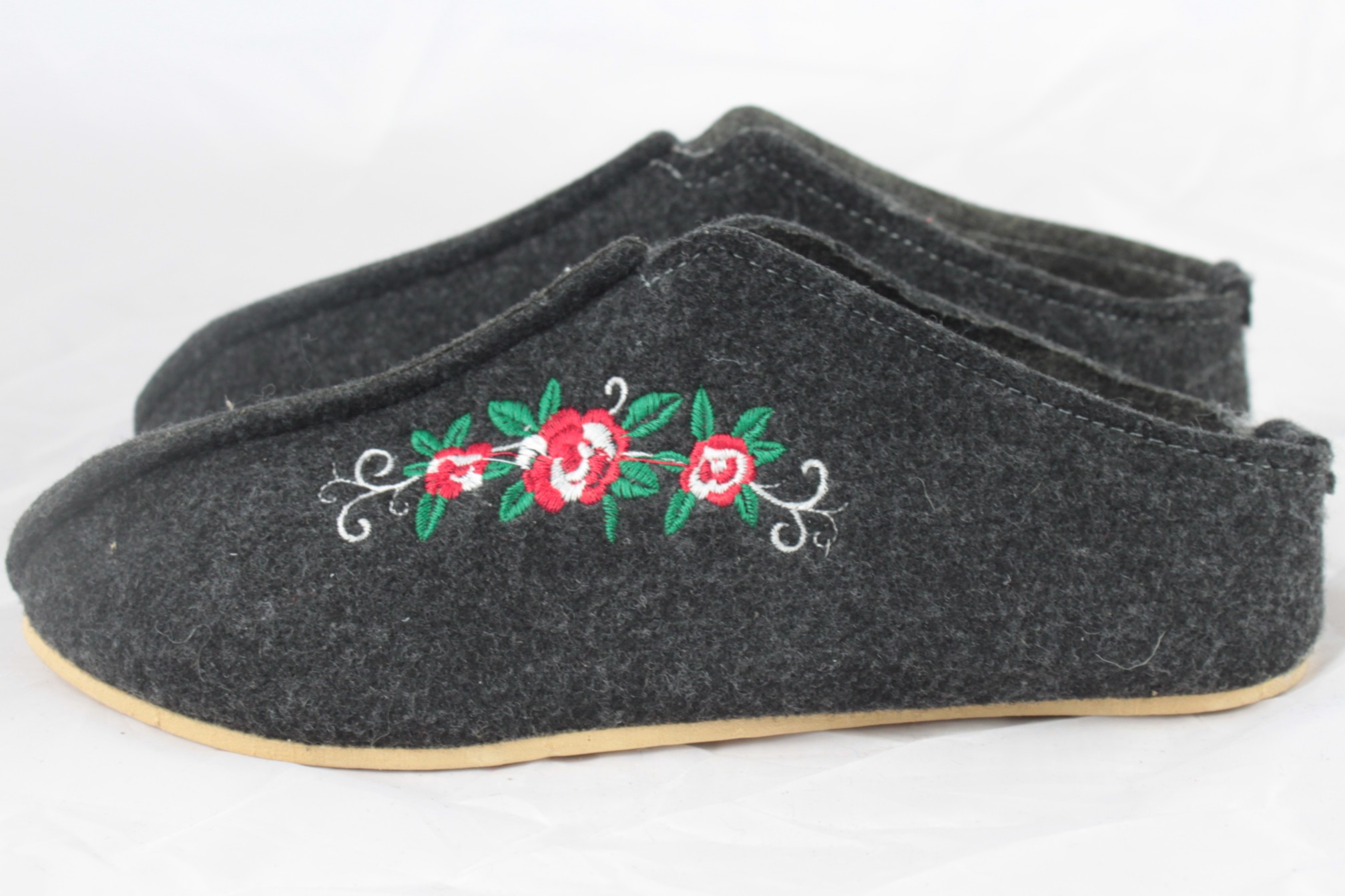 Kapcie wykonane z naturalnego barwionego filcu, wykonane w sposób tradycyjnych kierpcy góralskich, wkładka wykonana z filcu naturalnego, wierzch oraz wewnętrzna część wykonana z filcu z wszytym wzorem kwiatków, podeszwa płaska z lekkiej i wygodnej gumy antypoślizgowej. Kapcie z piętą w rozmiarówce standardowej
