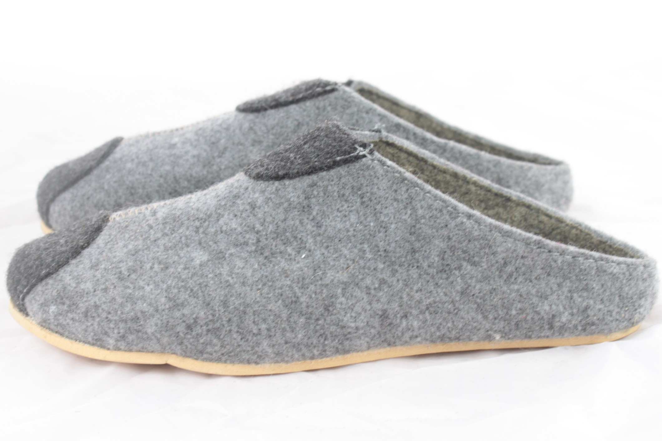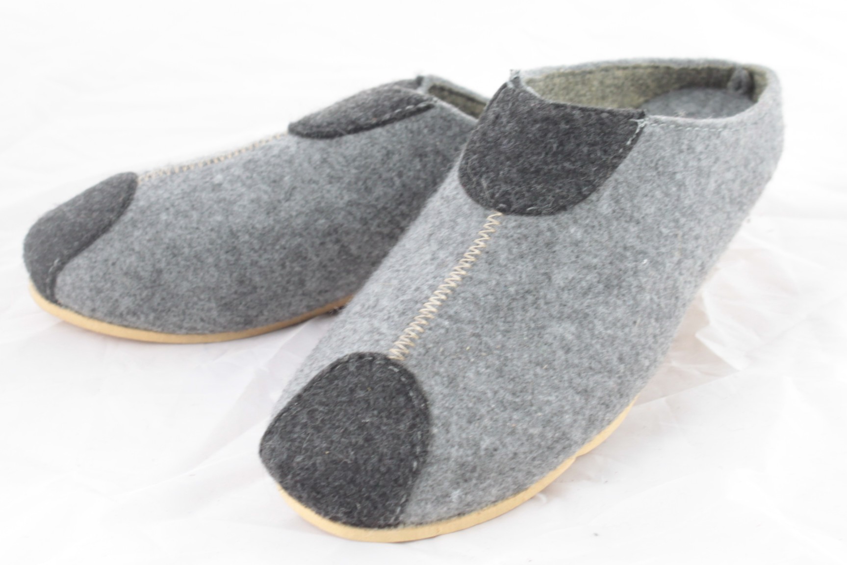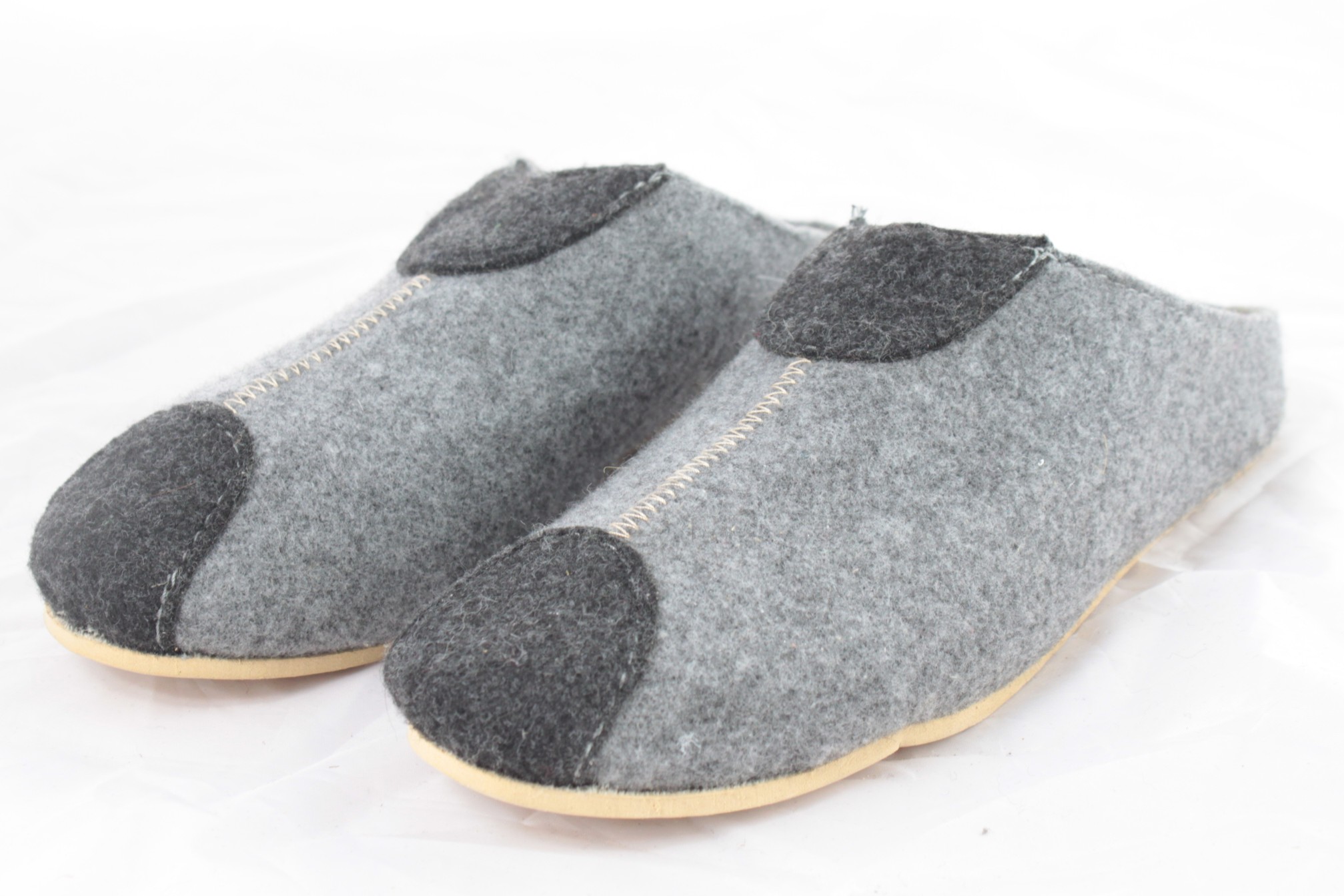 Góralskie klapki 100% polski produkt. Ten model pantofli tworzą najwyższej jakości materiały. Wkładka zrobiona jest z filcu naturalnego, wierzch oraz wewnętrzną część pokrywa filc, cholewka z motywem szycia przechodzącego przez środek oraz ozdobne łaty, podeszwa wykonana z gumy antypoślizgowej. Takie połączenie sprawia, że buty te są wytrzymałe i solidne, ale jednocześnie bardzo wygodne. Filc jest materiałem przetworzonym z wełny dzięki czemu jest bardzo ciepły a zarazem miękki i lekki. Idealnie dopasowuje się do każdej stopy standardowej oraz szerszej. Delikatna zapiętka podtrzymuje kapcie na nodze