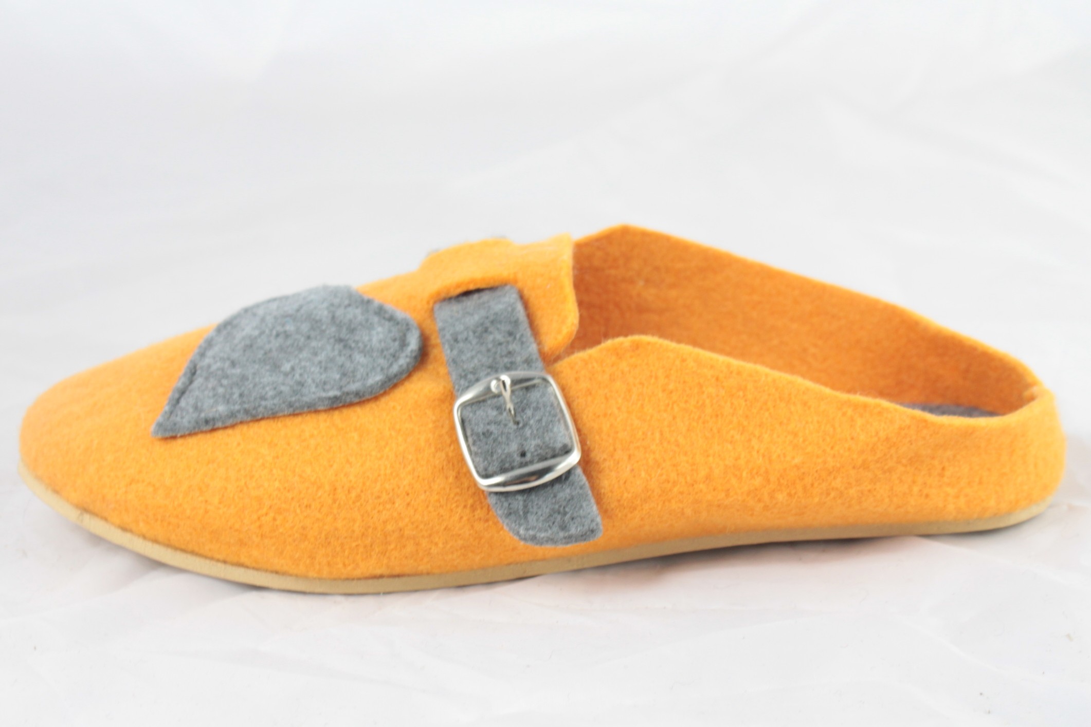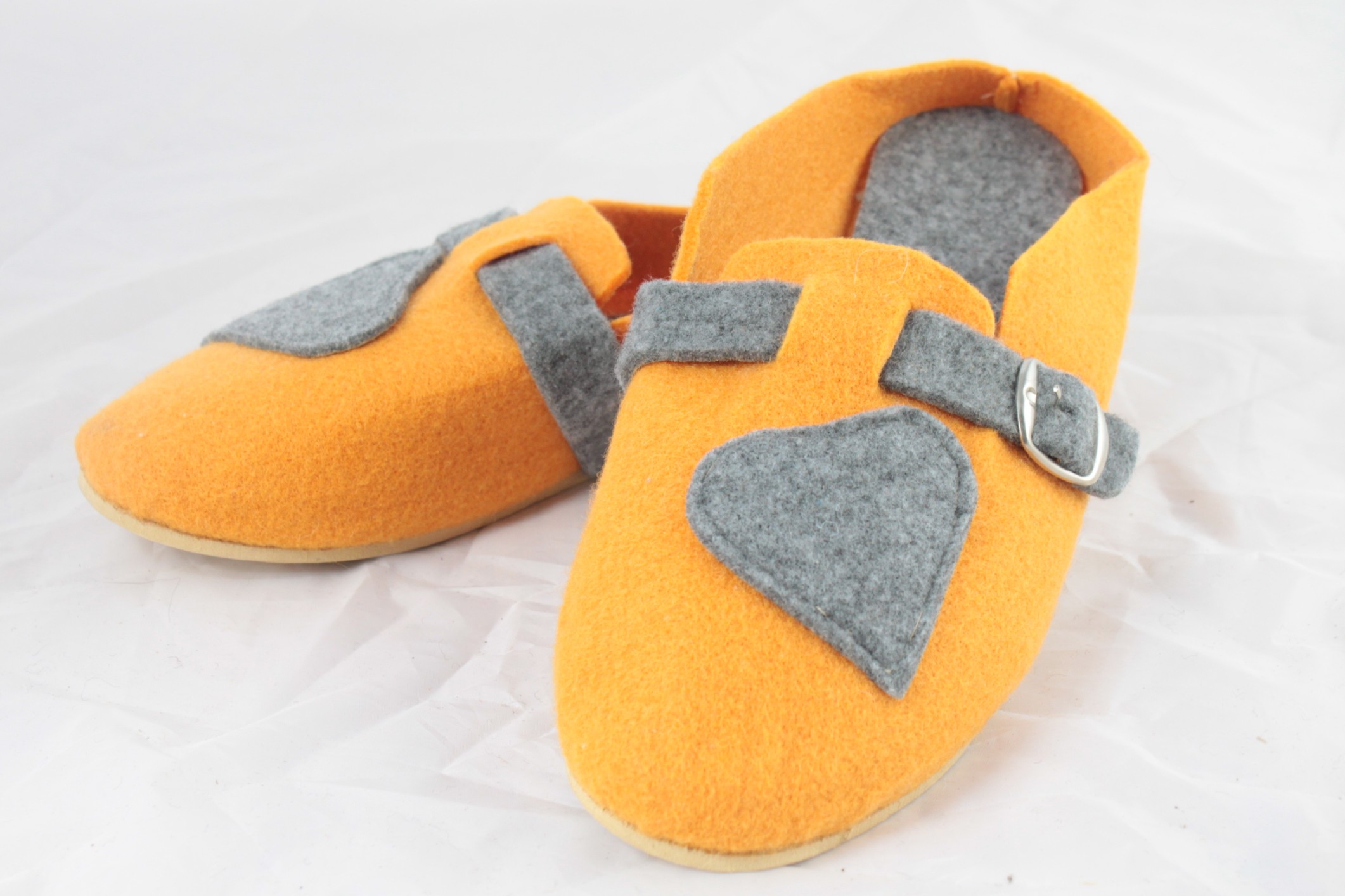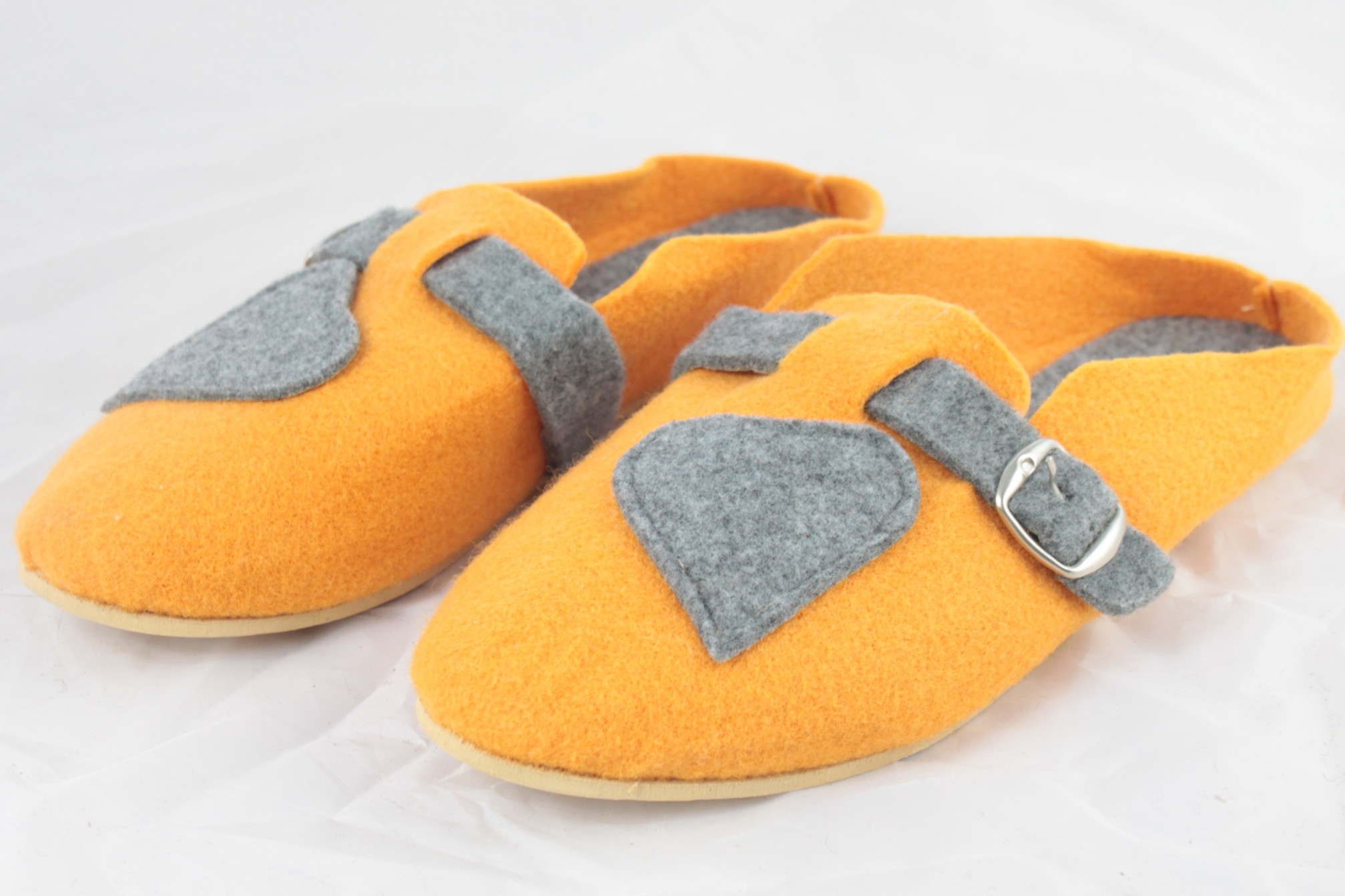 Góralskie klapki 100% polski produkt. Ten model pantofli tworzą najwyższej jakości materiały. Wkładka zrobiona jest z filcu naturalnego, wierzch oraz wewnętrzną część pokrywa filc, cholewka z motywem naszytego serca oraz metalową klamrą pozwalającą na regulacje podbicia , podeszwa wykonana z gumy antypoślizgowej. Takie połączenie sprawia, że buty te są wytrzymałe i solidne, ale jednocześnie bardzo wygodne. Filc jest materiałem przetworzonym z wełny dzięki czemu jest bardzo ciepły a zarazem miękki i lekki. Idealnie dopasowuje się do każdej stopy standardowej oraz szerszej. Delikatna zapiętka podtrzymuje kapcie na nodze