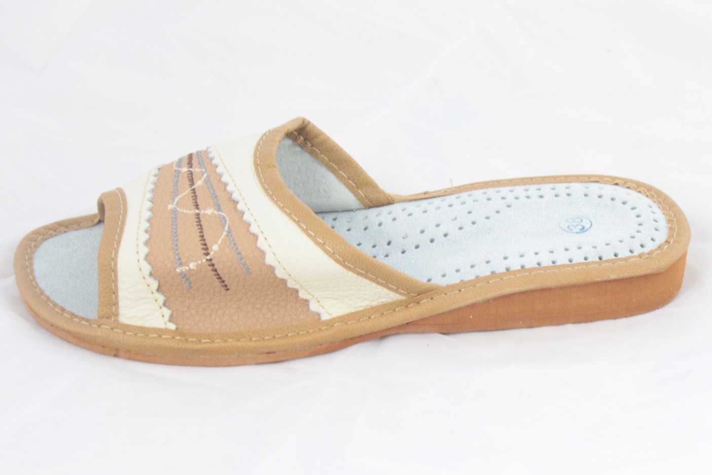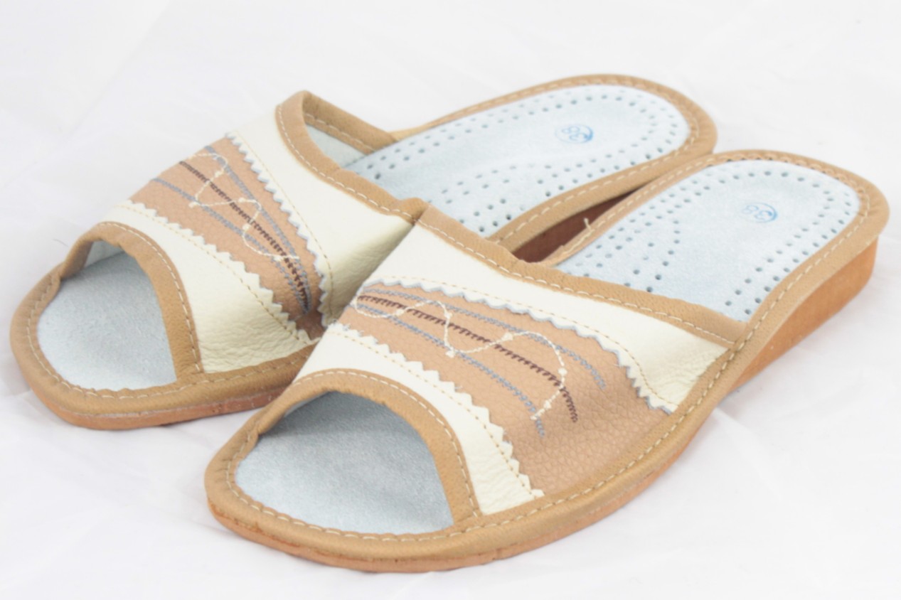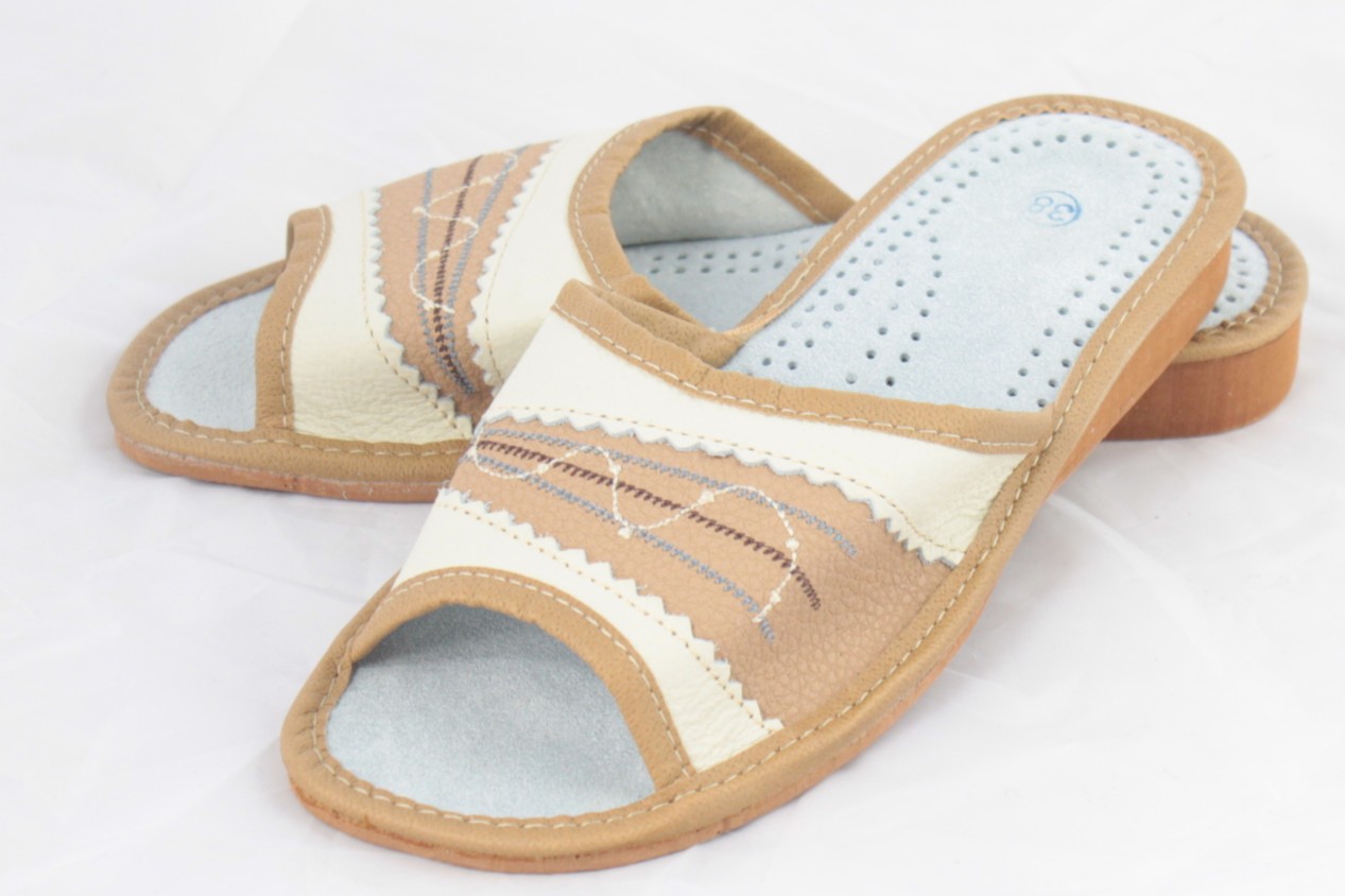 Góralskie klapki 100% polski produkt. Ten model pantofli tworzą najwyższej jakości materiały. Wkładka zrobiona jest ze skóry naturalnej nielicowana, profilowana, dziurkowana, wewnętrzna część cholewki materiał tekstylowy, wierzch pokrywa skóra ekologiczna wraz z haftem, a podeszwa to lekka i wygodna guma antypoślizgowa.