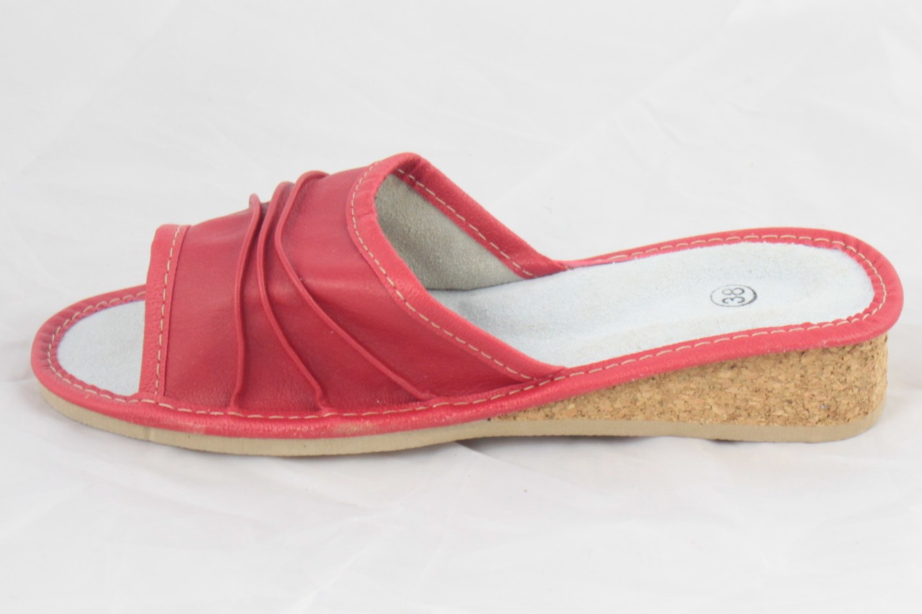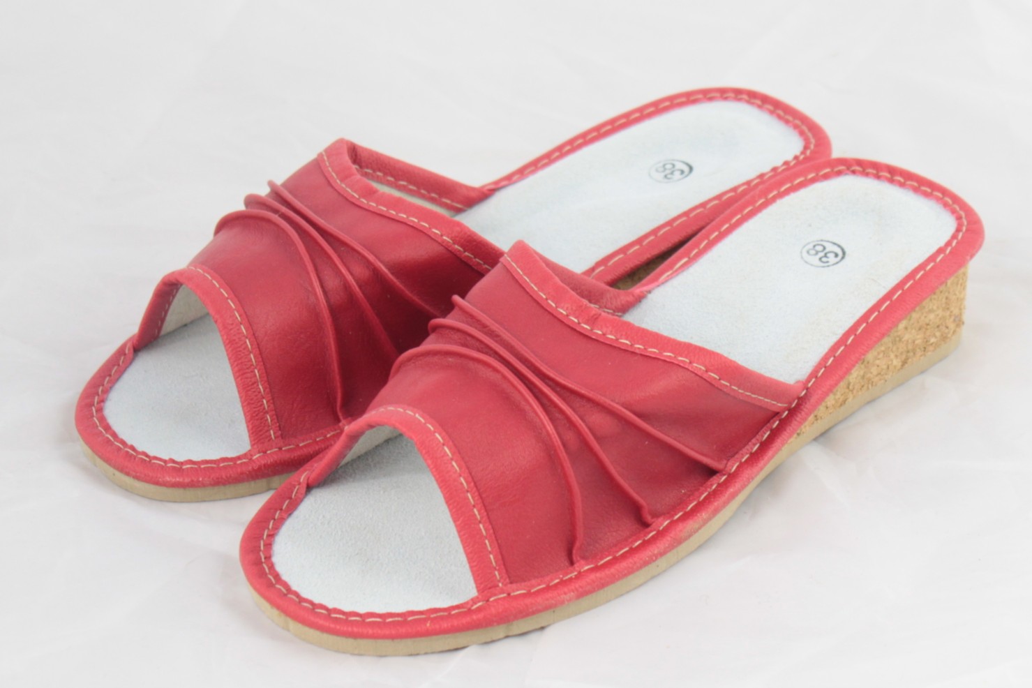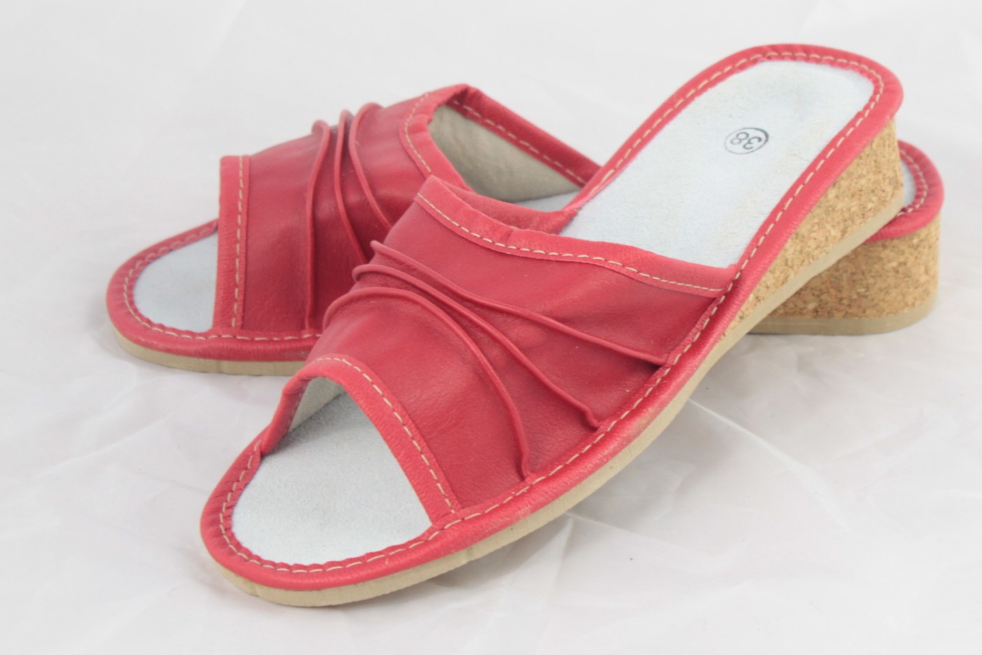 Góralskie klapki 100% polski produkt. Ten model pantofli tworzą najwyższej jakości materiały. Wkładka zrobiona jest z naturalnej skóry nielicowanej, wewnętrzna część cholewki materiał tekstylowy a wierzch pokrywa skóra ekologiczna, podeszwa zakończona lekką i wygodną gumą antypoślizgową wraz z koturnem korkowym 4,5cm. Takie połączenie sprawia, że buty te są wytrzymałe i solidne, ale jednocześnie bardzo wygodne.