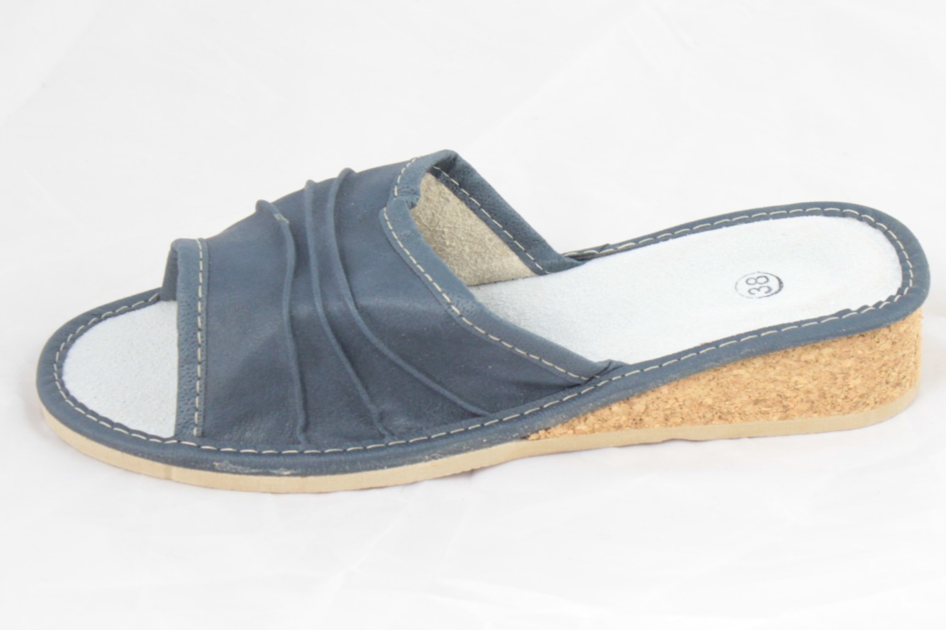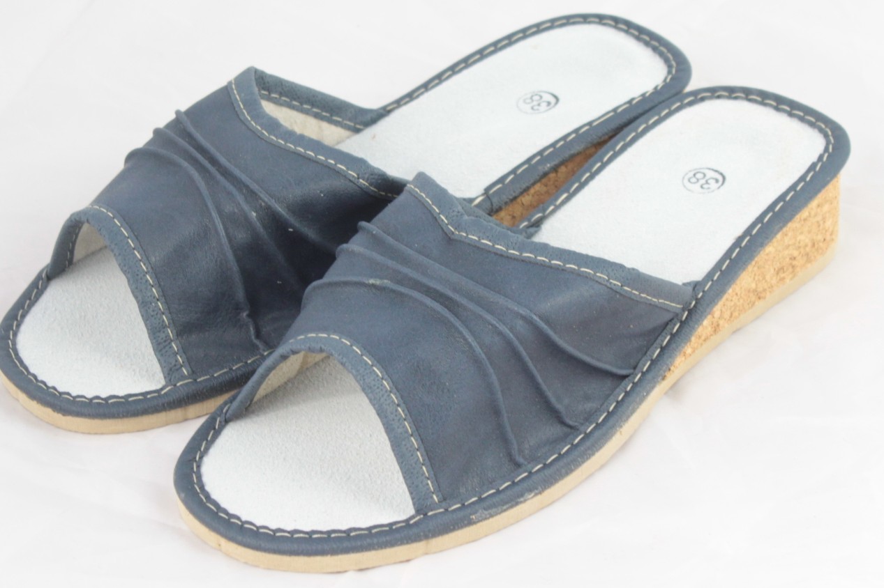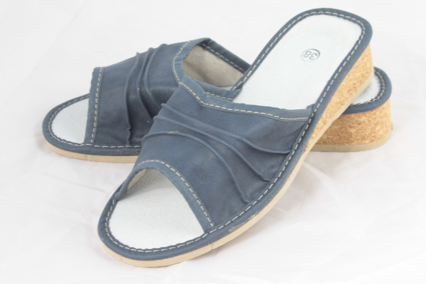 Góralskie klapki 100% polski produkt. Ten model pantofli tworzą najwyższej jakości materiały. Wkładka zrobiona jest z naturalnej skóry nielicowanej, wewnętrzna część cholewki materiał tekstylowy a wierzch pokrywa skóra ekologiczna, podeszwa zakończona lekką i wygodną gumą antypoślizgową wraz z koturnem korkowym 4,5cm. Takie połączenie sprawia, że buty te są wytrzymałe i solidne, ale jednocześnie bardzo wygodne.
