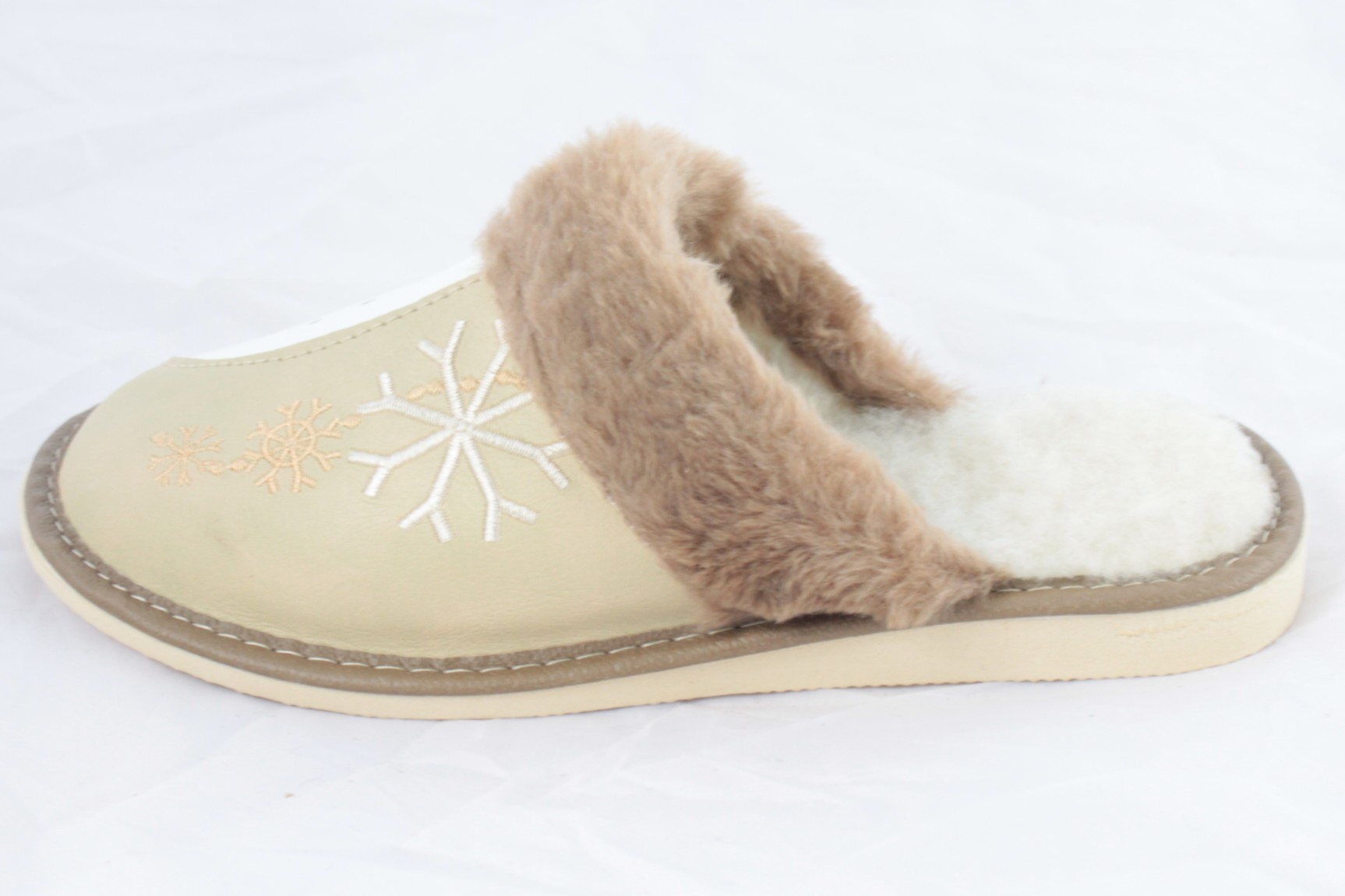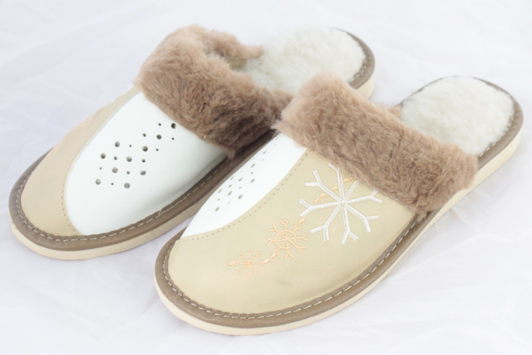 Góralskie klapki 100% polski produkt. Ten model pantofli tworzą najwyższej jakości materiały. Wkładka zrobiona jest z wełny naturalnej, wierzch pokrywa skóra naturalna licowana, dziurkowana, cholewka pokryta wzorem haftowanym śnieżynki oraz wychodzącą częścią wełny ozdabiającej kapcie, a podeszwa to lekka i wygodna guma antypoślizgowa. Takie połączenie sprawia, że buty te są wytrzymałe i solidne, ale jednocześnie bardzo wygodne.