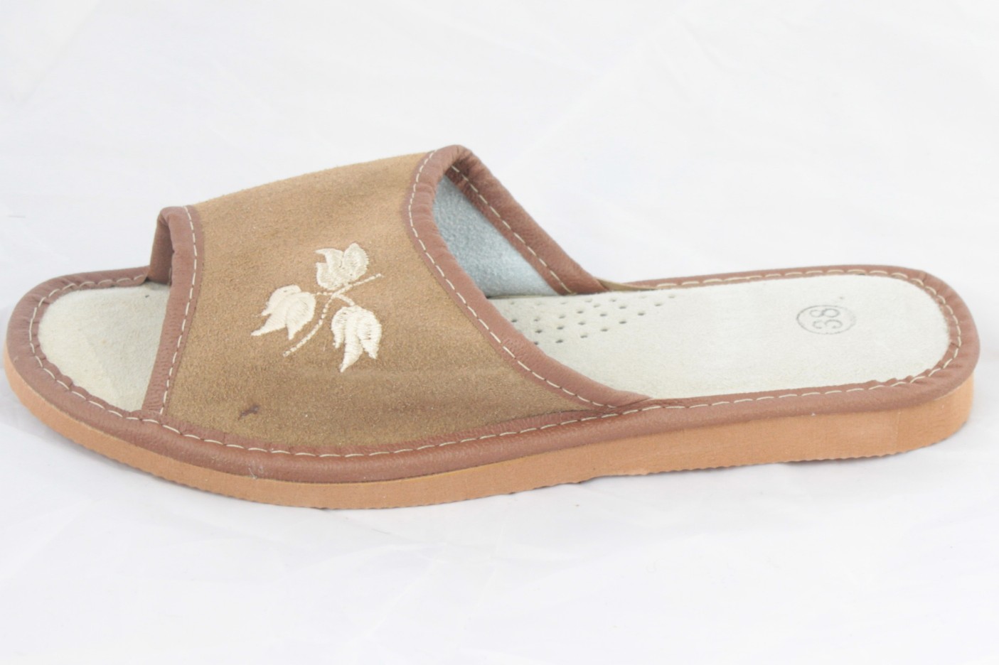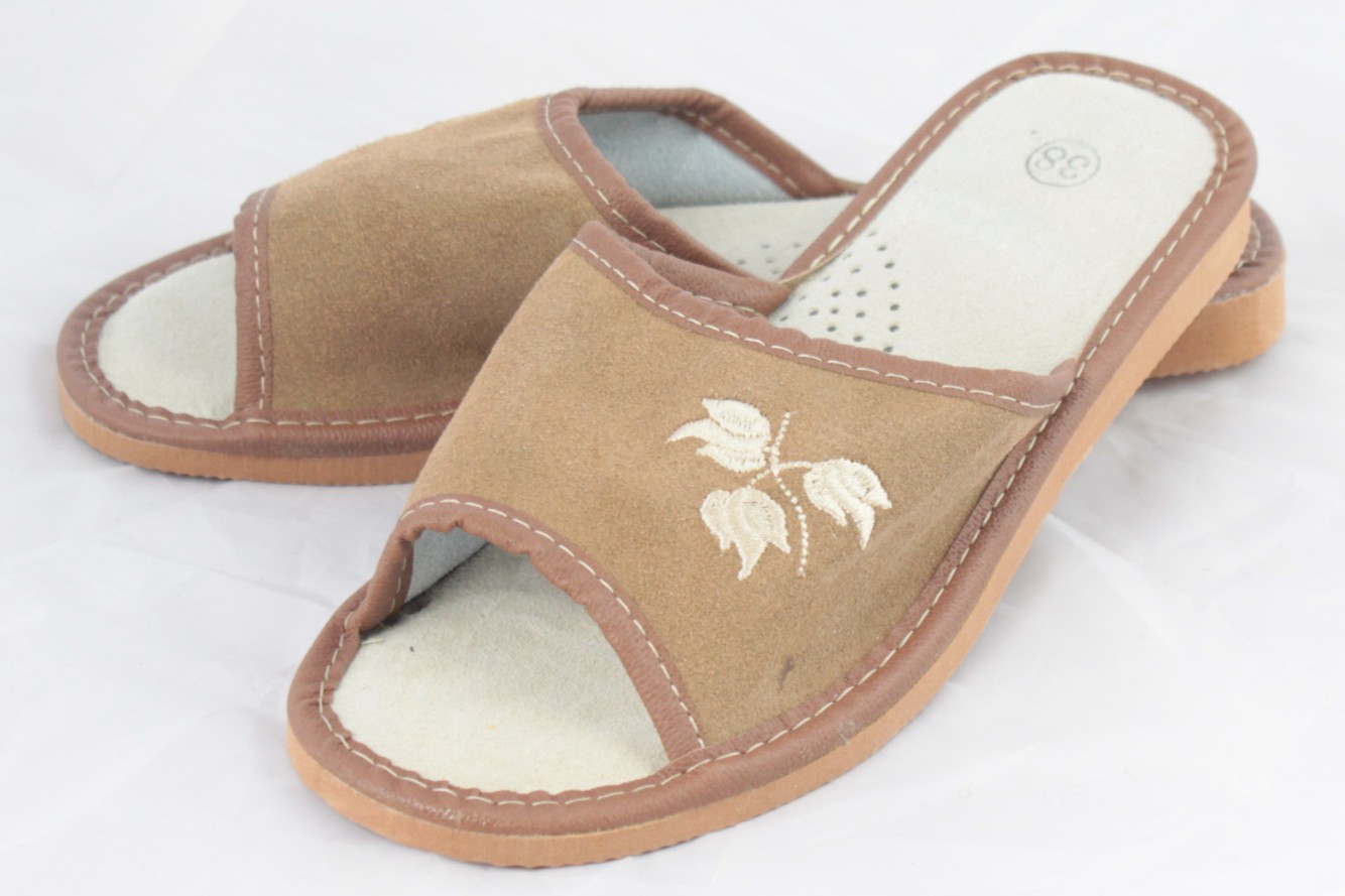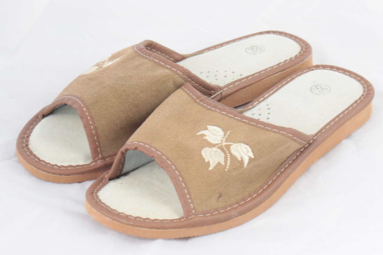 Góralskie klapki 100% polski produkt. Ten model pantofli tworzą najwyższej jakości materiały. Wkładka zrobiona jest ze skóry naturalnej nielicowana, profilowana, dziurkowana, a podeszwa to lekka i wygodna guma antypoślizgowa. Wewnętrzna część cholewki skóra naturalna nielicowana, wierzch pokrywa naturalny zamsz wraz z haftem. Takie połączenie sprawia, że buty te są wytrzymałe i solidne, ale jednocześnie bardzo wygodne. Rozmiarówka standard.