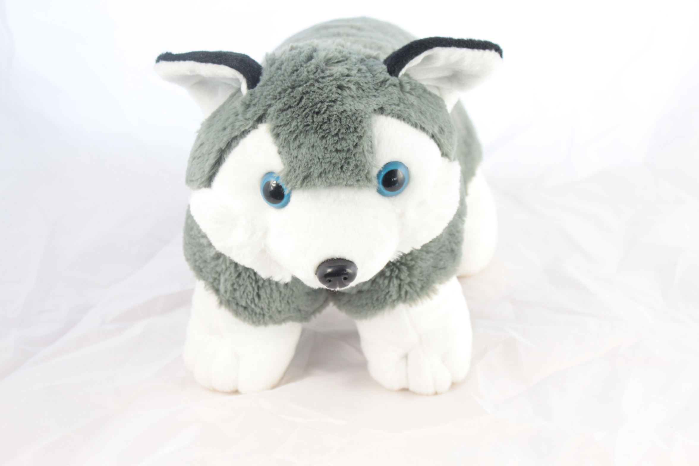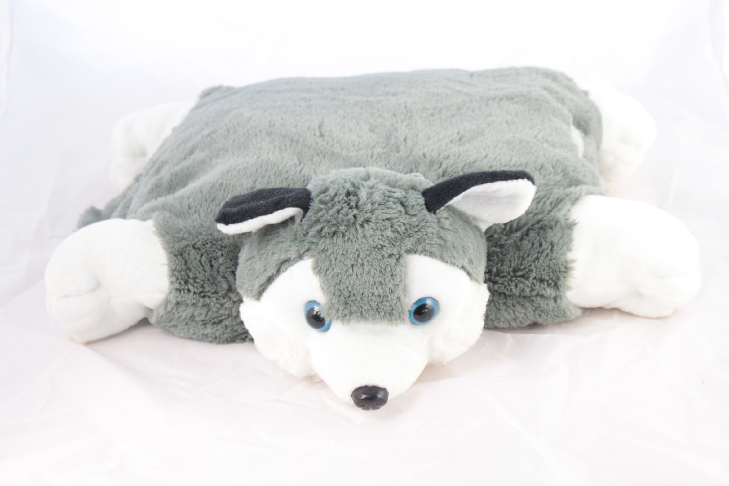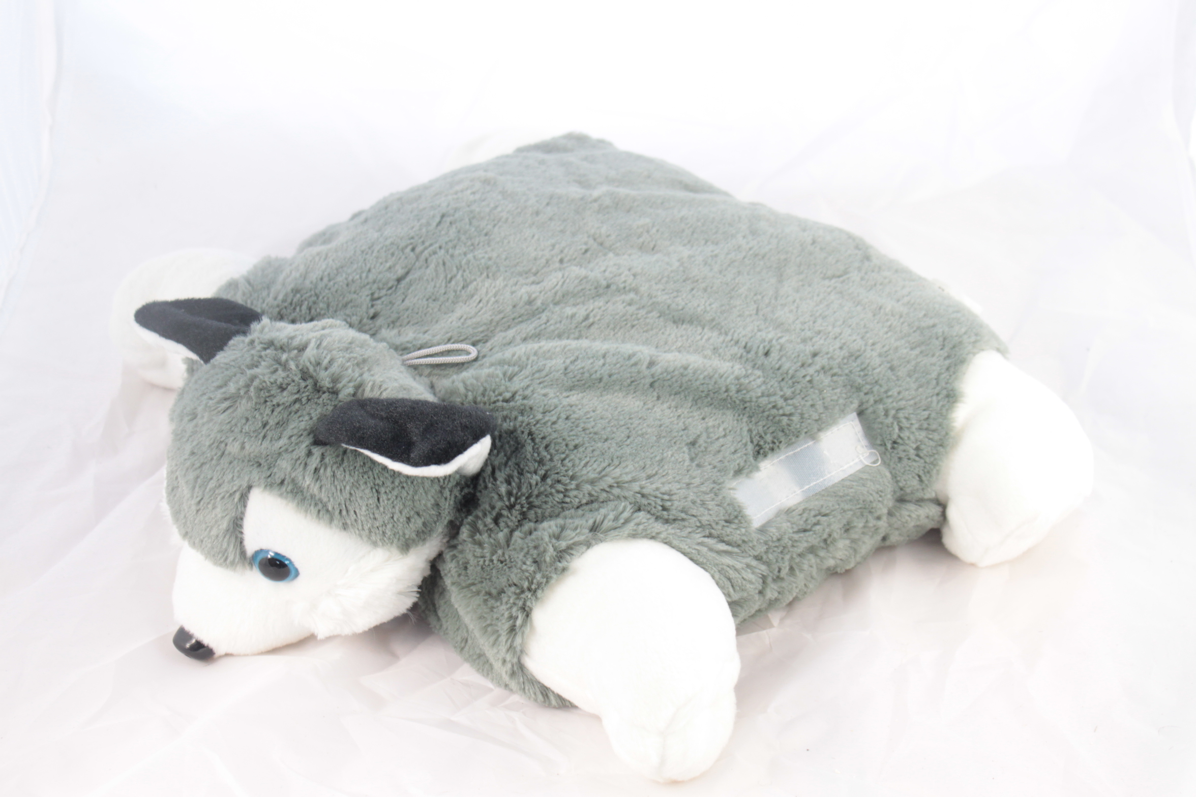 Poduszka składana w postaci wilka. Maskotka jest wykonana z przyjemnego materiału, wypełniona pluszem, miękka i bardzo miła w dotyku. Poduszka posiada rzepy, którymi spina się w postać stojącej wilka. Poduszka może posłużyć jako podgłówek do spania, ale też zabawka, przytulanka lub artykuł dekoracyjny.